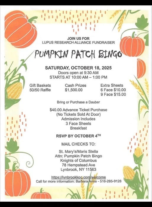 ![]() | Pumpkin Patch Bingo – Fundraiser for Lupus Research Enjoy a morning of bingo, raffle baskets, and fun—all while supporting lupus research. Tickets include breakfast and three face sheets. |