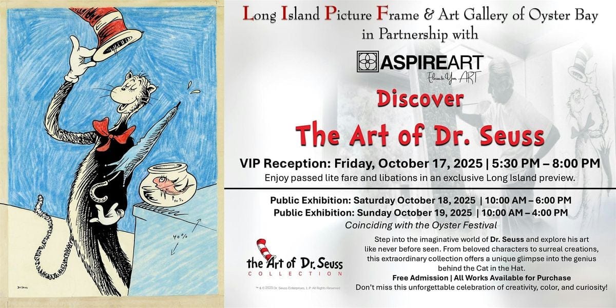![]() | Discover The Art of Dr. Seuss Step into the whimsical world of Dr. Seuss during Oyster Festival weekend! Enjoy the VIP reception Friday evening, then explore the public exhibition Saturday and Sunday featuring serigraphs, sculptures, and rare works from his “Secret Art.” Free admission; all works available for purchase. |