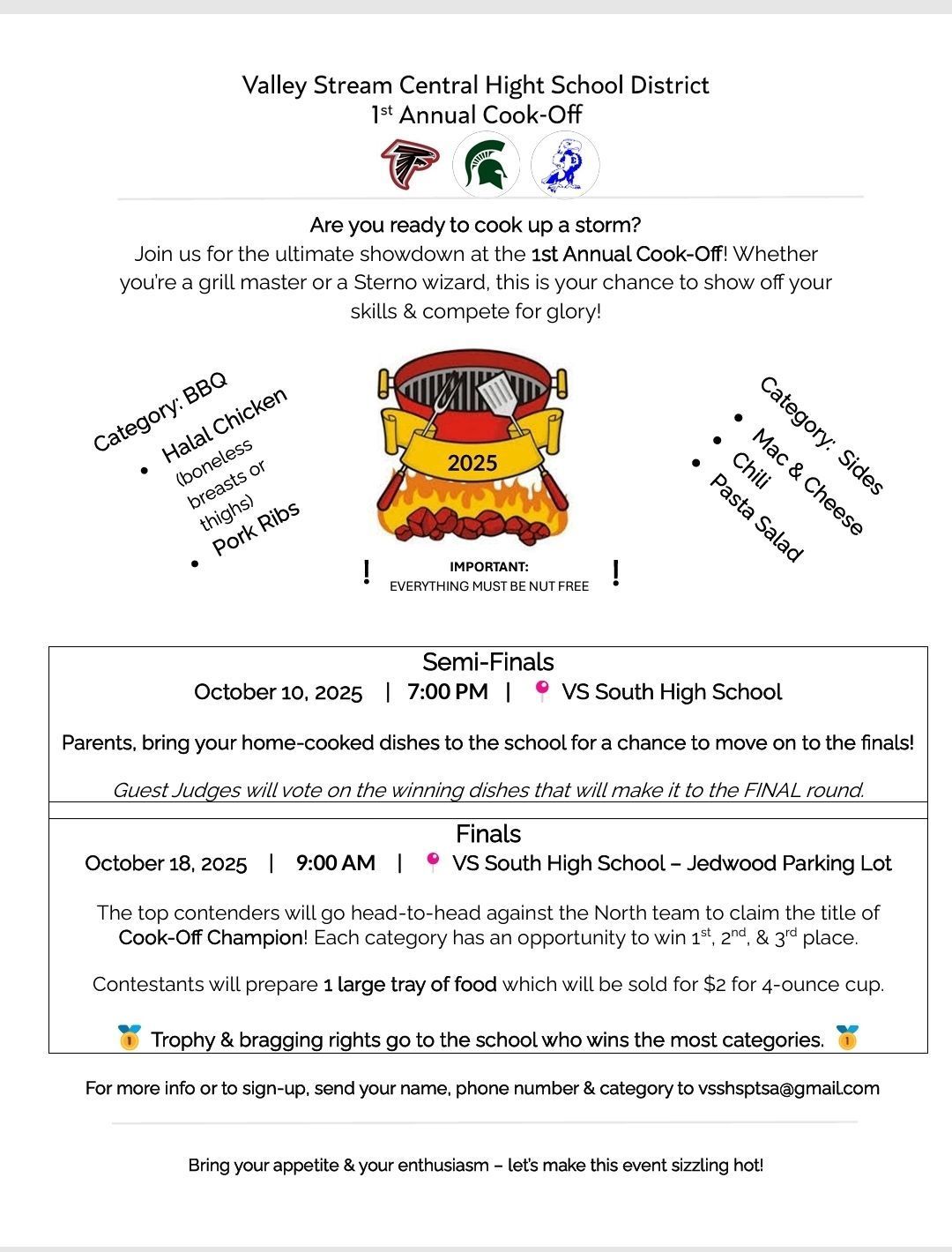 ![]() | 🧸 Kid-Friendly 1st Annual Cook-Off: Finals The top contenders face off to claim the title of Cook-Off Champion! Contestants will prepare trays of food sold for $2 per 4-ounce cup, with trophies and bragging rights going to the school that wins the most categories. |