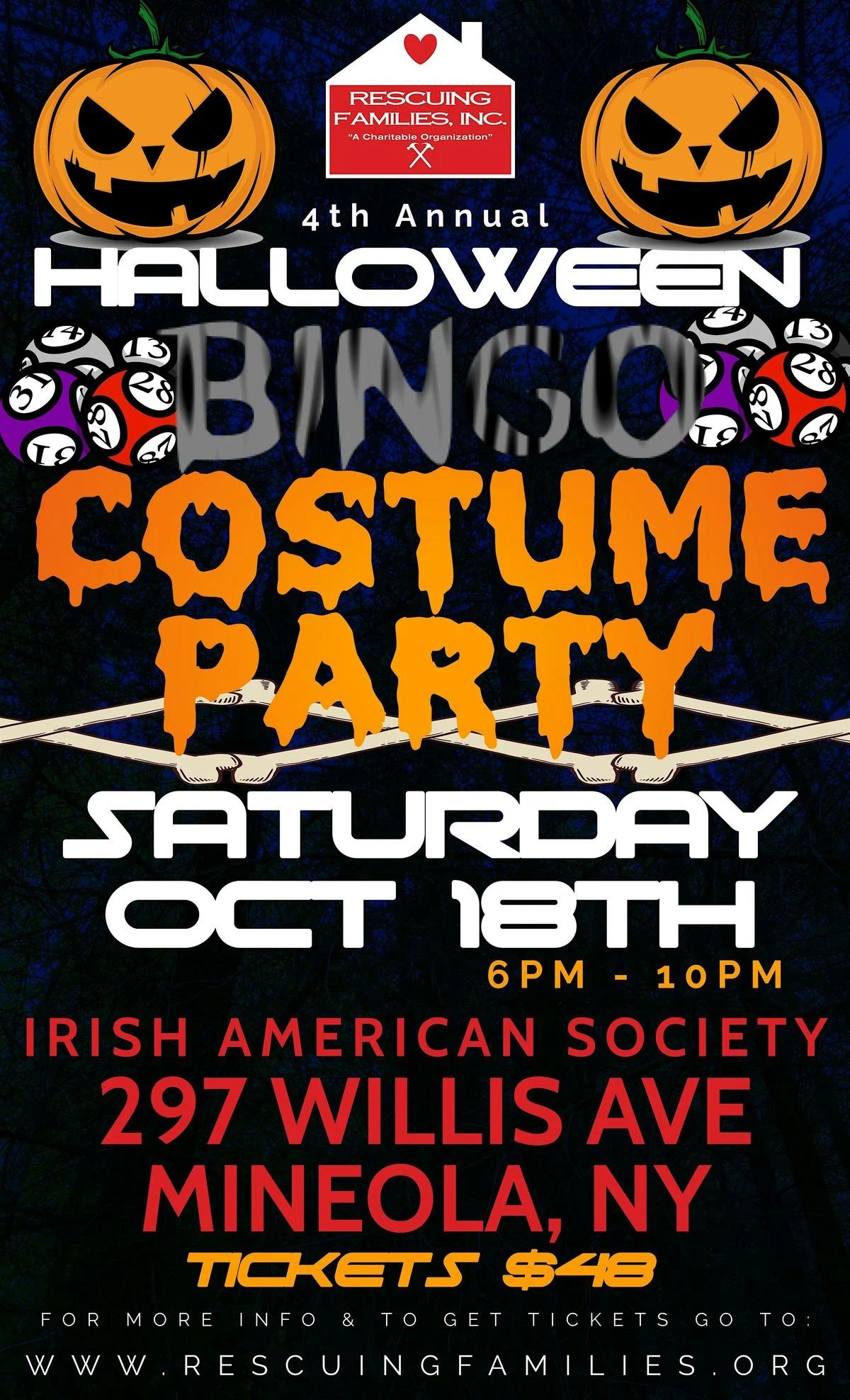 ![]() | Rescuing Families 4th Annual Halloween Bingo Costume Party Enjoy a Halloween-themed night with bingo, raffles, prizes, costume contests, food, drinks, and fun—all to support families in need. Includes 5 bingo games, buffet, drinks, and raffle entry, with proceeds going toward home repairs for disabled families on Long Island. |