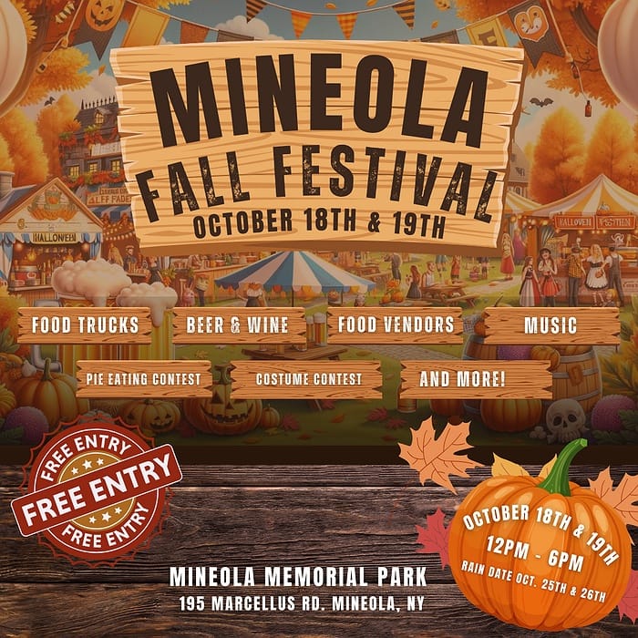 ![]() | 🧸 Kid-Friendly Mineola Fall Festival Saturday, October 18, 2025 – Sunday, October 19, 2025 Celebrate autumn with a weekend of food trucks, a seasonal vendor market, live music, pumpkin patch fun, kids’ games, and contests. Free admission for all ages! |