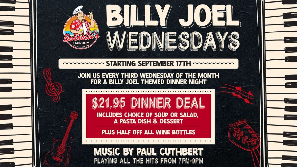 ![]() | Billy Joel Wednesdays Enjoy a Billy Joel–themed night at Borrelli’s Taproom with a $21.95 dinner deal, half-off wine bottles, and live music by Paul Cuthbert. |