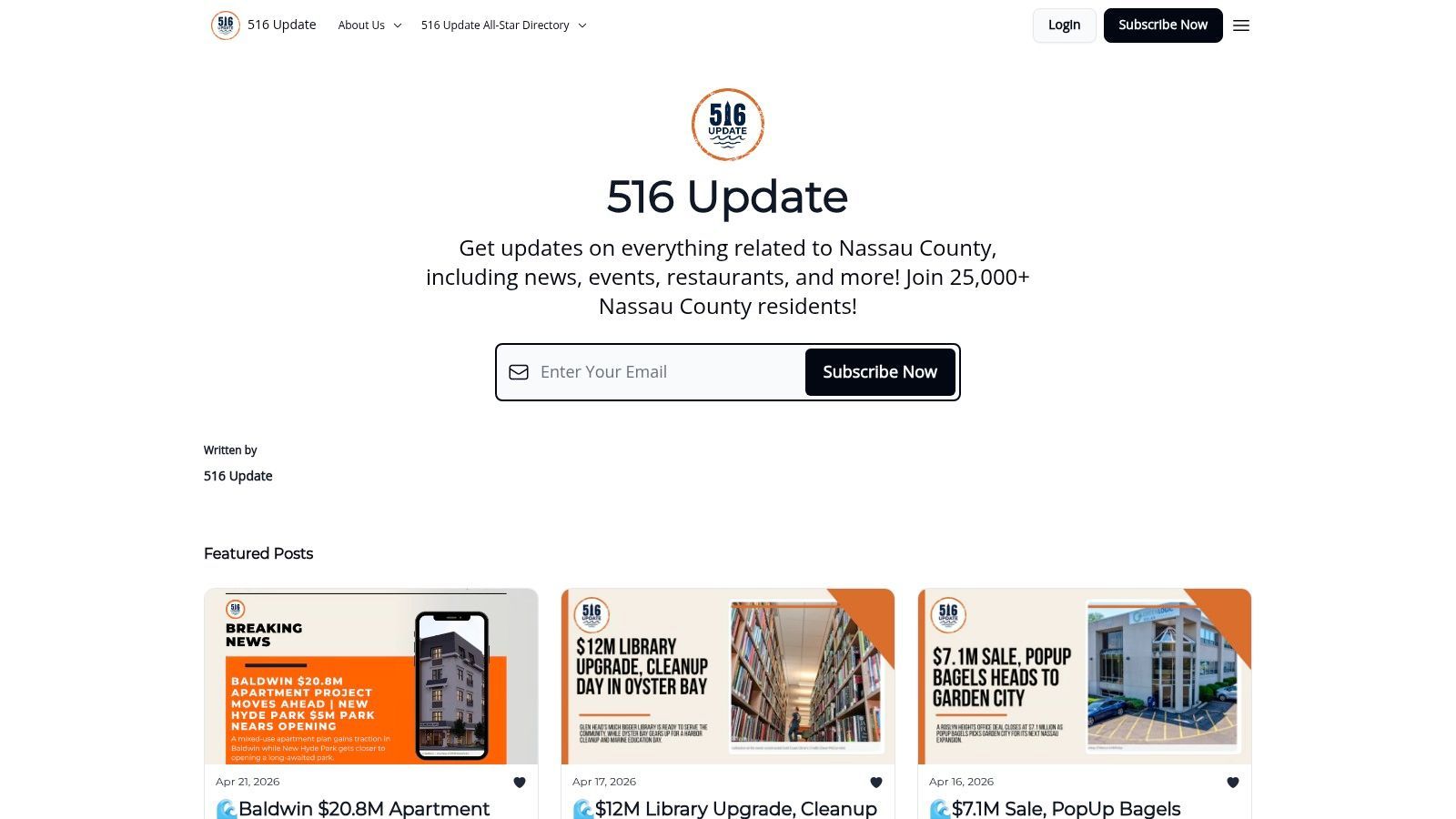 516 Update | Low, simple subscribe/read flow | Low for readers; moderate editorial resources for publisher | Timely hyper-local news, event discovery, small-business promotion | Nassau County residents, local businesses, visitors planning outings | ⭐ Hyper-local reporting; All‑Star Business Directory; frequent updates |